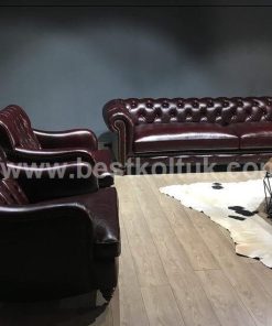 Acı kahve renk deri koltuk takımı, zarif tasarımı ve hakiki deri kaplaması ile yaşam alanlarınıza klasik bir hava katıyor. Birinci sınıf malzeme ve kaliteli işçilik ile üretilen bu koltuk takımı, uzun ömürlü kullanım sağlar.
